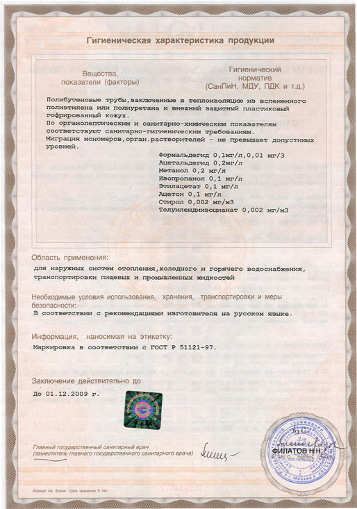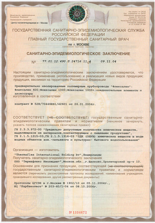 Санитарно-эпидемиологическое заключение: Флексален 600, Флексален 1000, Флексален 1000+, соединительные элементы и аксессуары. Лист №1.